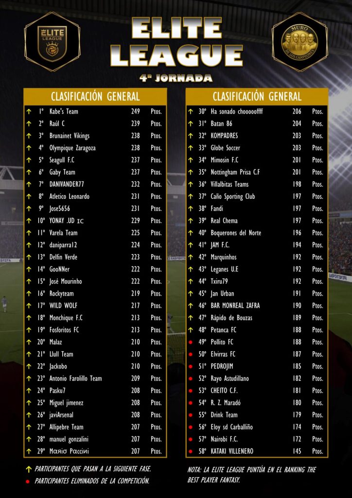 La Liga Élite se encamina a la recta final de esta primera fase y las cosas siguen estando más que apretadas para lograr un pase. KATAKI VILLENERO es el único que parece fuera de la ecuación situándose a casi 40 puntos de la salvación. En el resto de usuarios hay una igualdad terrible ya que desde el penúltimo clasificado hasta los puestos de salvación solo hay 16 puntos de diferencia. Estamos hablando de una ronda, por tanto, apretadísima donde seguro que habrá sorpresas en la recta final. Nadie puede respirar tranquilo, quizás Kabe´s Team que sigue siendo líder una jornada más. Veremos como termina todo esto y habrá que estar pendientes ya que los usuarios que están eliminados en este momento de la temporada seguro que intentan cambiar su estrategia para remontar puestos en la tabla clasificatoria.