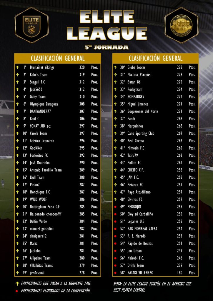 La Liga Élite se encamina a la recta final de esta primera fase y las cosas siguen estando más que apretadas para lograr un pase. KATAKI VILLENERO es el único que está fuera de la siguiente fase al estar virtualmente ya eliminado. En el resto de puestos hay muchísimas más dudas ya que todos los jugadores siguen con opciones de salvación a falta de dos jornada. Los que peor lo tienen son Drink Team, Nairobi F.C. y Jan Urban pero todos están a una distancia salvable. Tendrán que arriesgar, eso si. Desde el último puesto de descenso hasta la salvación hay muy poca distancia por lo que muchos jugadores siguen en riesgo y una mala jornada les puede arrastrar al pozo en esta primera fase. Solo quedan dos jornadas, poco o mucho tiempo según se mire. Buena suerte a todos en esta recta final de la primera fase. Por la zona noble tenemos cambio de líder esta jornada.