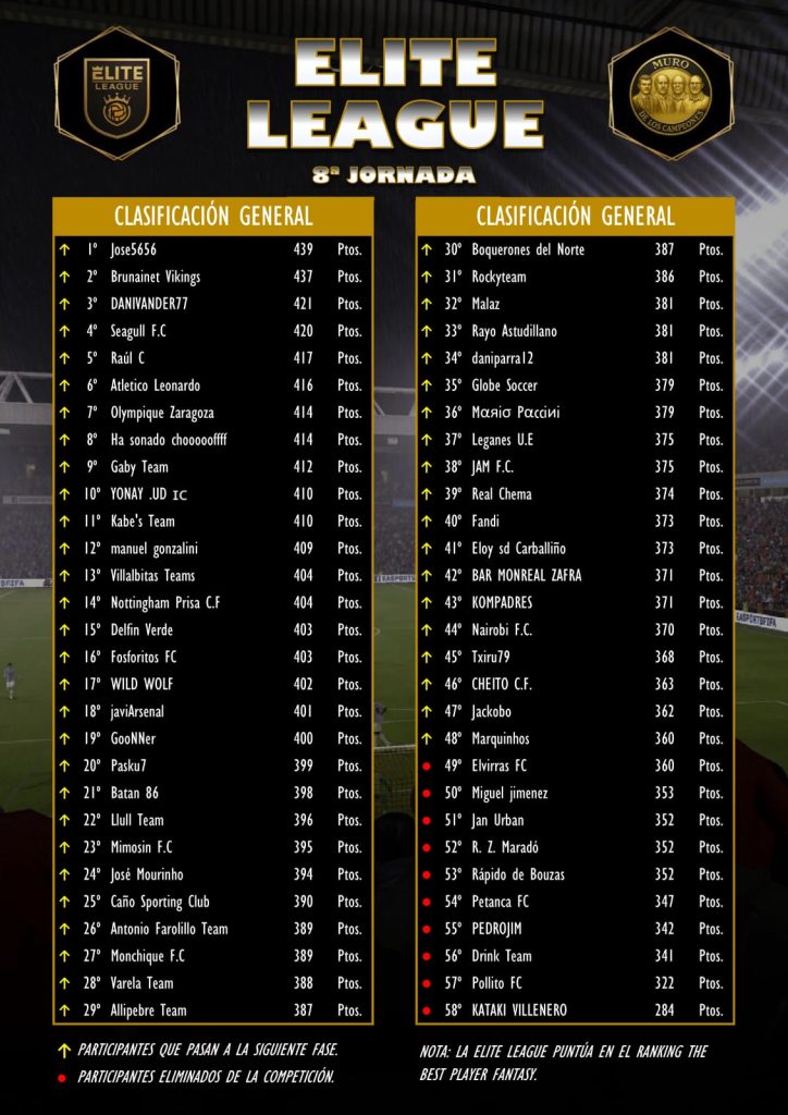 La Liga Élite da por cerrada su primera fase con las diez primeras eliminaciones de la temporada. KATAKI VILLENERO, Pollito FC, Drink Team. PEDROJIM, Petaca FC, Rápido de Bouzas, R.Z. Maradó, Jan Urban, Miguel jimenez y Elvirras FC son los primeros eliminados de la temporada y es momento de dar un pequeño homenaje a estos jugadores que lo han dado todo para pasar a la siguiente ronda. Elvirras FC queda eliminado por la diferencia del VM con Marquinhos que pasa más que apurado a la siguiente fase. También nos abandona un campeón de liga Elite como es R.Z. Maradó…poca broma con las eliminaciones que hemos tenido nada más empezar el campeonato. Menos KATAKI VILLENERO que renunció demasiado pronto el resto han tenido opciones hasta la última jornada y en las últimas semanas ha habido un auténtico baile de puestos en la zona baja. Una auténtica pena pero el formato prometía emociones y así ha sido. Espero de corazón que os haya gustado esta novedad en la normativa de esta temporada. Un abrazo muy fuerte a nuestros diez campeones que dejan el barco en este momento. A los clasificados, se arranca el miércoles y el martes se mandarán los enlaces de los distintos grupos. Jose5656 acaba siendo el MVP final de la primera fase después de varios cambios también en los puestos de honor del campeonato.