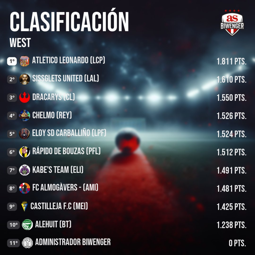 Acabamos con la conferencia West donde domina con claridad Atlético Leonardo por más de 150 puntos, aspecto que se ha confirmado en las rondas bonus y que le servirá para ser el ganador de esta fase. Otro grupo en el que tenemos todo por decidir con dos jugadores que intentan salir de la quema y otros dos que ya están fuera. Alehuit y Castilleja F.C. se despidieron del campeonato pero FC Almogávers y Kabe´s Team esperan el fallo para asaltar la clasificación de fase y hay hasta tres jugadores que pueden verse fuera en la última jornada. Rápido de Bouzas no se puede despistar y Eloy SD Casrballiño y Chelmo también tienen que andar al loro, como diría Laporta, por si acaso. Los tres primeros estarán tranquilos esta jornada. ¿Qué pasará al final? Ya lo veremos. ¡Suerte a todos!